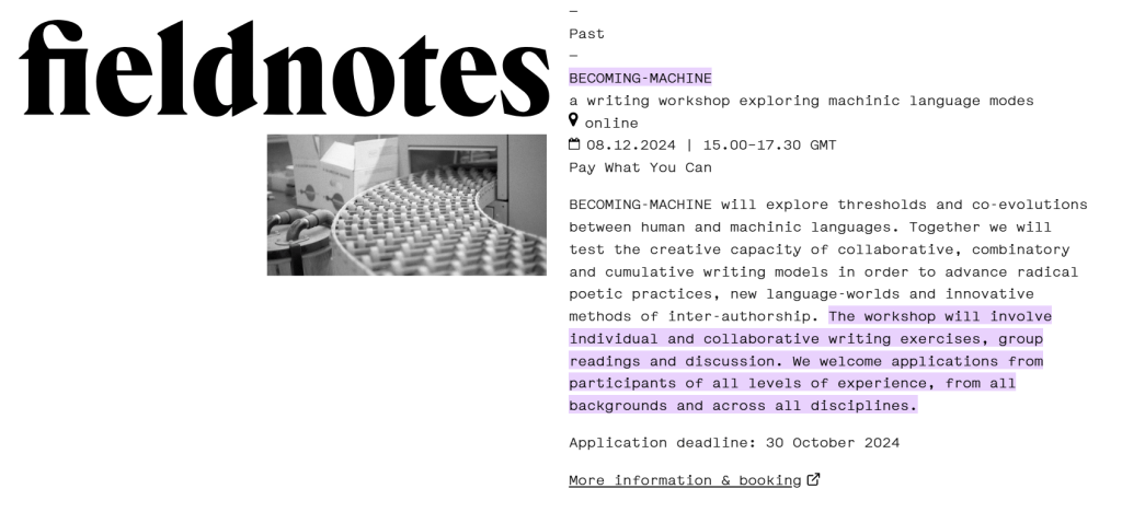 FIELDNOTES ran A WORKSHOP CALLED BECOMING MACHINE. I PARTOOK in it ON SUNDAY 8TH DECEMBER. SEE BLOG POST HERE SOON.